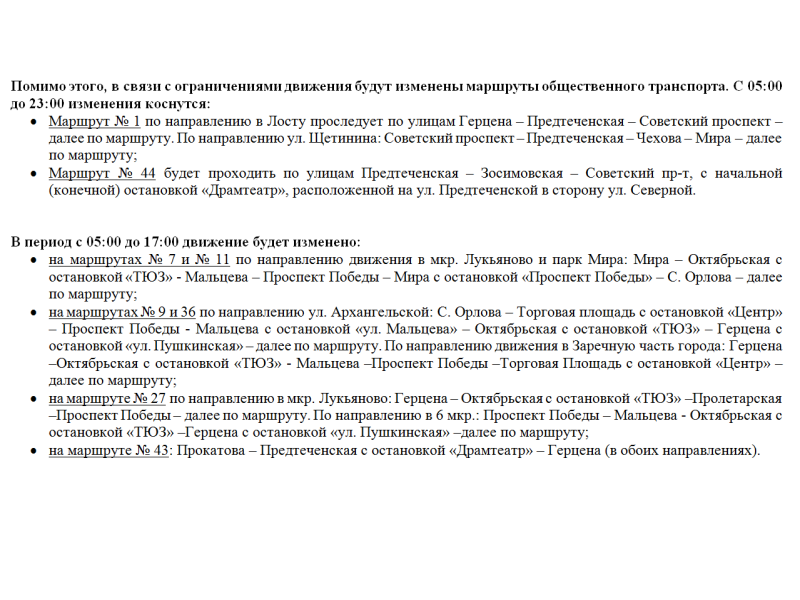 В дополнение к этому, в результате введенных ограничений на перемещение транспорта произойдет корректировка схем движения общественного транспорта.