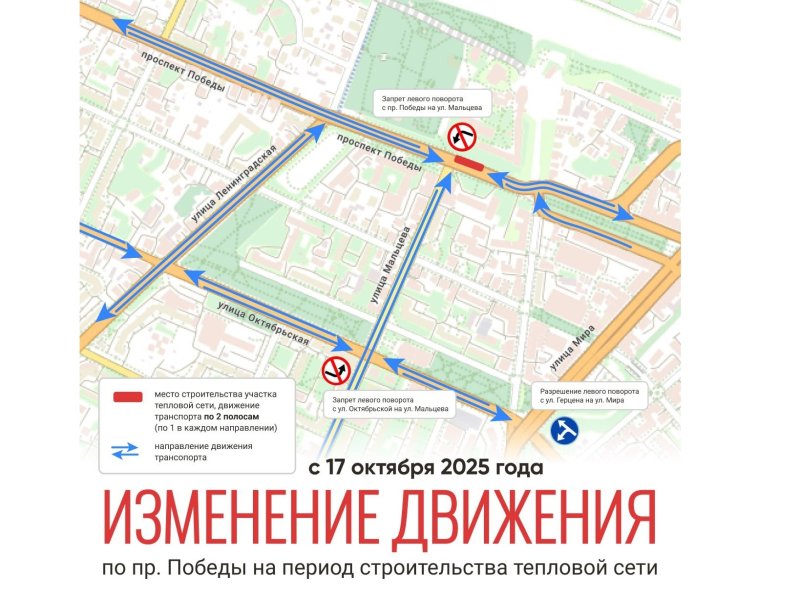 В связи с ремонтными работами будет запрещен поворот налево с проспекта Победы и улицы Октябрьской на улицу Мальцева при движении со стороны Ленинградской улицы. Однако будет разрешен левый поворот с улицы Герцена на улицу Мира.