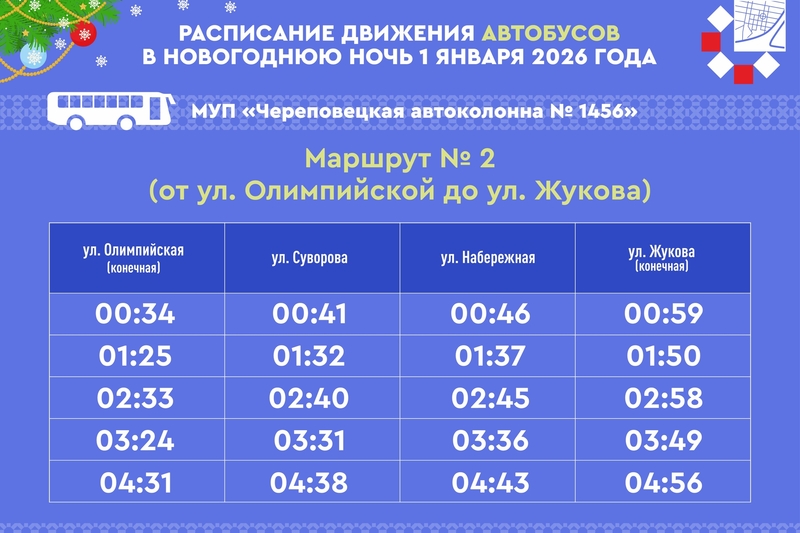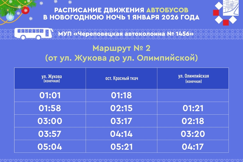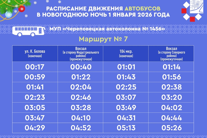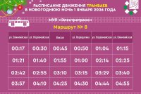 Также, в новогоднюю ночь будет запущен трамвайный маршрут №8, где три вагона будут курсировать с 0:17 до 5:50. Сообщает ИА «СеверИнфо».